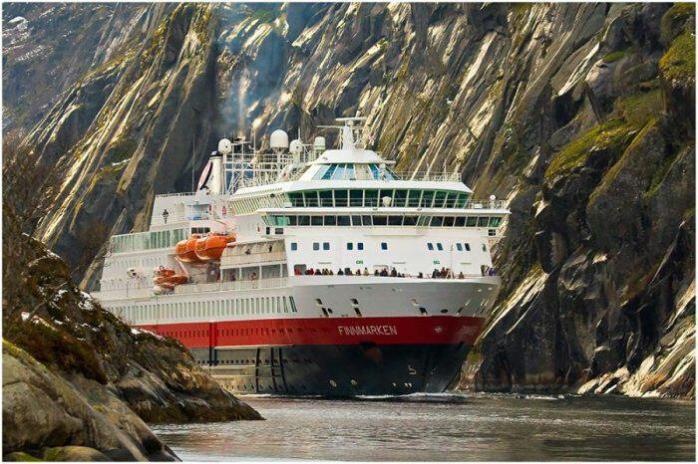Det ser ut for meg som om Hurtigruta er på veg ut av Trollfjorden (den ligger i Austvågøy i Hadsel kommune). For en som er født i Lofoten overgårIngen ting i verden en tur til Nord-Norge gjerne med bil og båt. Anbefaler på det sterkeste tiden fra medio mai til medio juli!