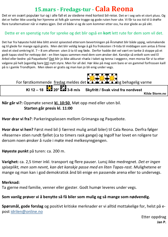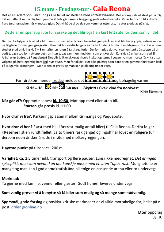 Tida flyr og ukene nå for tida er ikke lengre enn dagene i vår ungdom. Jeg gledet meg over den store oppslutningen sist fredag og sender, etter oppdrag, ut melding om ny tur kommende fredag. Ikke i konkurranse med Årsmøtet, men som oppvarming til møtet som starter kl. 18:00 om kvelden. Den som ikke blir med, er selv skyld.