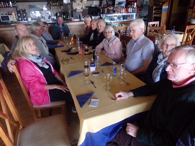 Legger også ved et bilde fra den flotte naturen sett sydvestover mot Portman og middelhavskysten mot innløpet til Cartagena. Et siste bilde er fra den populære fredagslunsjen. Her fra Pizzeria Di Mare i havneområdet Tomas Maestre. Her var vi 14 til bords ( 2 av turdeltakerne hadde andre avtaler mens 1 «felle» kom til). Her var det som vanlig god stemning med gode samtaler og latter. Restauranten har et godt spansk kjøkken og vi fikk salat, forrett, hovedrett, dessert og kaffe til den meget overkommelige prisen av 13 Euro pr. kuvert.
