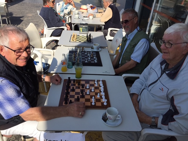 Denne lørdag var vi fire, som, søm møtte op og fik et par sjakk-spill. Det ene spil blev et “hængeparti”. Jeg vet ikke ordet på norsk. Det er et sjakkspil, som må fullføres senere. Google oversatte det således: “Ett spill ble en hengende fest” og festlig blev det da. Foto viser de tre spillere. Den fjerde er undertegnede, som fotograferet.
