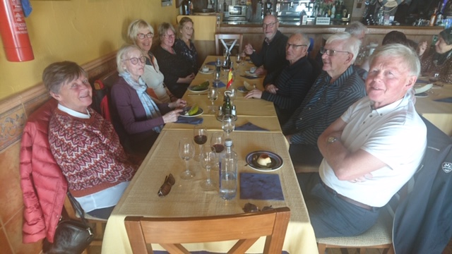 Legger ved noen bilder som illustrasjon: Ett hvor vi var samlet på første avsatsen med et kapell som viser den sterke katolske tilhørigheten blant gruvearbeiderne. Ett fra rasteplass oppe ved vindmøllene med inntak av medbrakt drikke og diverse frukt som energitilskudd. Ett utsiktsbilde fra stien opp mot vindmøllene over «Parque Minero» og gruvebyen La Union og endelig ett fra dagens sosiale høydepunkt, nemlig fredagslunsjen. Denne gangen, som for årets 2 forgående turer, var Pizzeria Di Mare i båthavna Tomas Maestre valgt som spisested. Her ble vi 18 til bords medregnet 3 feller som ikke var med på turen, men som er særdeles velkomne til å spise sammen med oss.